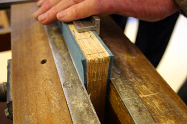 صحاف پس از چسباندن آستری کاغذی به همراه صفحه اول و آخر کتاب، شیرازه را به لبه پشت میچسباند.
