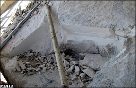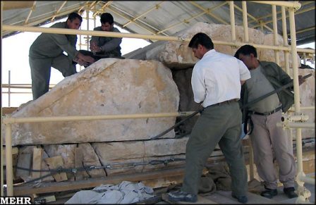 تصویری از نحوهی جابهجایی سنگهای سقف آرامگاه کورش که در آن بهکارگیری از شیوهها و ابزار ابتدایی و غیرحرفهای در جریان مرمت این اثر جهانی کاملاً مشخص است. چنان که در عکس ملاحظه میکنید نحوهی بهکارگیری اهرم فلزی برای جابهجایی سنگ موجب صدمه به سنگهای زیرین و خراش و خسارت آنها شده است. |