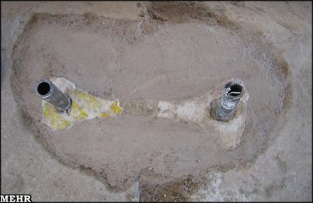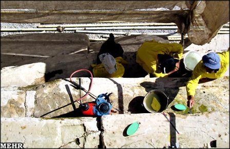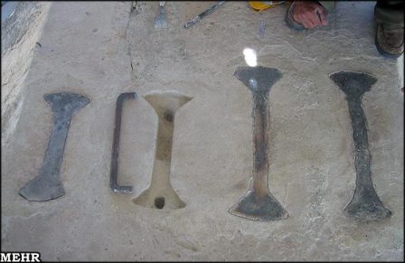 نمونه سیمان به کار رفته در سنگهای آرامگاه و روش احیای بستهای فلزی که در آن از سیمان استفاده شده است. |