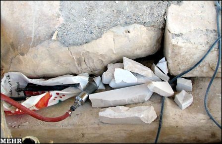 تصویر، گویای همه چیز هست. بهجای تراش دادن علمی و اصولی سنگی جدید، سنگ تاریخی بنا را که از قدمتی چند هزار ساله برخوردار است با شیوهای کاملاً غیرعلمی تراش داده و تخریب کردهاند. تراشههایی که ملاحظه میکنید متعلق به قطعهسنگی از بدنهی آرامگاه است. |