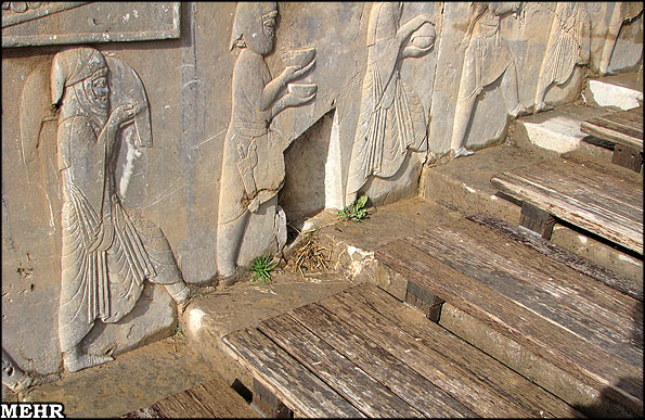 به مدد راه پله های چوبی زیر پای مهمانان پادشاه هخامنشی که هر کدام پیشکشی بر دست دارند علف سبز شده است!