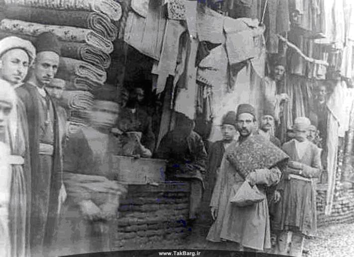 «مردم گوناگونی در این بازارها در رفت و آمدند: لوطیها که کلاه را کج گذاشته، تکمهٔ پیراهن را گشوده و خودنمایانه دست بر قبضهٔ قمهٔ خود نهادهاند. فروشندگان میوه و کره و پنیر و آجیل که متاع خود را بر دراز گوشهای سفید بار کرده و تبلیغ کالای خود را به الحان گوناگون میخوانند، نابینایان و گدایان اشعار شاعران سلف را در مایهها و آهنگهای متنوع میسرایند و نقالان که هر یک در گوشهای معرکه گرفته، باد به گلو انداخته و از پهلوانیها افسانه می گویند. گاه میرزایی که قلمدان از پر شالش دیده می شود، شتابان برای خود راهی باز می کند. آن سو درویشی که تخته پوستی به پشت انداخته و تبرزینی بردوش نهاده، با خراطی که سخت مشغول تراشیدن تنهٔ قلیانی است، سرگرم گفتگوست و شاهزاده ای افغانی، که خود سوار است و نوکرانش پیاده او را در میان گرفته اند، با جلال و جبروت تمام می گذرد. بخش عمده ای هم زنان خانه دارند که بخصوص در بازار کفاشان و بّزازان بیشتر از جاهای دیگر اجتماع می کنند.