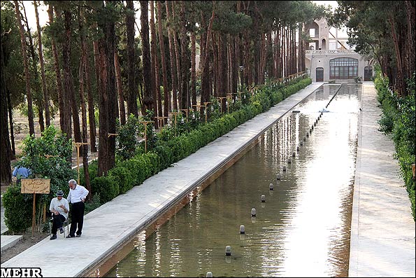 نمایی از حوض و باغچه اطراف آن در باغ دولت آباد