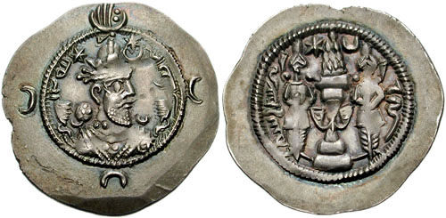 سکۀ خسرو انوشیروان که چهرۀ او بر روی آن حک شده است