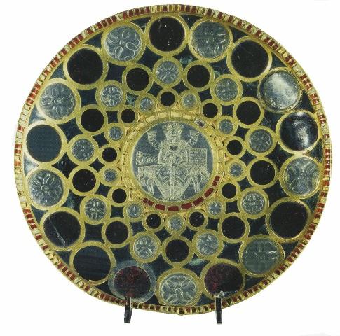 نگارۀ انوشیروان در میان آوندی زرین و بلورین با رنگ های سبز و سپید و سرخ