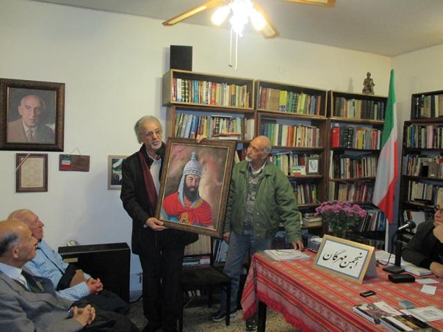 سپس استاد محمود قاضی زاهدی از تابلوی «بابک خرمدین» رونمایی کردند. استاد دست اندرکار کشیدن تابلو از بزرگان ایران زمین هستند و این کار را با چهرهی دکتر مصدق آغاز کردهاند و تا کنون 12 تن از بزرگان این سرزمین را به تصویر کشیدهاند. ایشان همهی این تابلوها را در انجمن مهرگان رونمایی کردهاند.