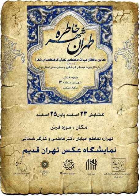 کانون حافظان میراث فرهنگی تهران قدیم نمایشگاه عکس تهران قدیم با عنوان «طهران، شهره خاطره» در موزه فرش برگزار میکند. این نمایشگاه در روز سه شنبه 23 اسفندماه 1390 دایر میشود و تا 25 اسفند برقرار می باشد. ساعات بازدید از این نمایشگاه در روز سه شنبه 23 اسفند از ساعت 9 صبح تا 13، و در روز چهارشنبه 24 بهمن از ساعت 9 صبح تا 16، و در روز پنج شنبه از ساعت 9 صبح تا 12 خواهد بود.