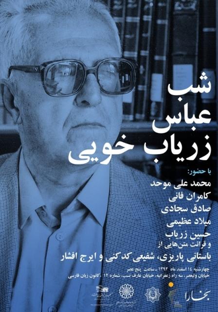 مجله بخارا شب « عباس زریاب خویی » را با همکاری مؤسسه فرهنگی هنری ملت، دایرة العمارف بزرگ اسلامی، بنیاد موقوفات دکتر محمود افشار و گنجینه پژوهشی ایرج افشار برگزار می کند.