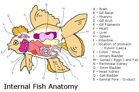 اندامهای اصلی از جمله قلب ، کلیه ها ، کبد مشابه با دیگر مهره داران است و علاوه بر آن دارای یک عضو نگهدارنده و شناور کننده پر از هوا موسوم به بادکنک شنا می باشد. واضحترین تفاوت میان اعضای داخلی ماهی و دیگر مهره داران ، وجود آبشش بجای شش هاست و ماهی ها از طریق جریان پیدا کردن آب به داخل آبششها تنفس می کنند.
