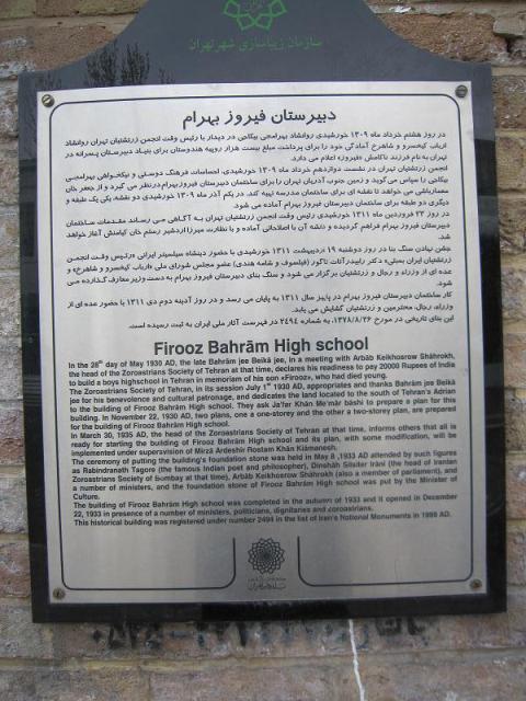 دبیرستان فیروز بهرام از دهش بهرامجی بیکاجی به یادگار از فرزندش فیروز که در آغاز شهریور ۱۲۷۴ه. ش (۱۸۹۵ م) در هندوستان زاییده شده و در هشتم دیماه ۱۲۹۴ ه.ش (۱۹۱۵م) جهان را بدرود گفتهاست بنام دبیرستان فیروز بهرام نامگذاری گردید. ساخت این دبیرستان در ۱۸ اردیبهشت ۱۳۱۱ ه.ش بر روی زمین انجمن زرتشتیان و به سرپرستی اردشیر کیامنش و به رهنمون ارباب کیخسرو شاهرخ آغاز و در دوم دیماه همان سال پایان یافت.