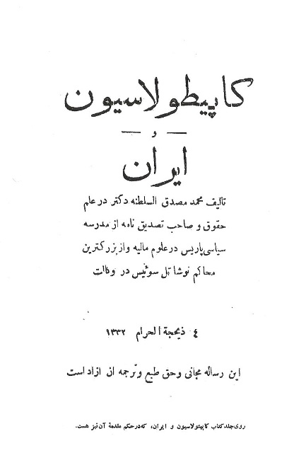 ایرانبوم افتخار دارد نسخۀ اینترنتی كتاب كاپیتولاسیون و ایران نوشتۀ دكتر محمد مصدق را برای نخستینبار در تاركدۀ جهانی منتشر میكند. كتاب یاد شده در سال 1290 خورشیدی به قلم شادروان دكتر محمد مصدق به چاپ رسیده است. این کتاب بار دوم با مقدمه و حواشی و تعلیقات استاد فریدون جنیدی در سال 1358 تجدید چاپ شده است. باز نشر دیگر آن، در كتابِ «مصدق و مسائل حقوق و سیاست»، با گردآوری شادروان ایرج افشار، نشر سخن، تهران، 1382، در رویههای 39 تا 77 به زیور طبع آراسته شده است.