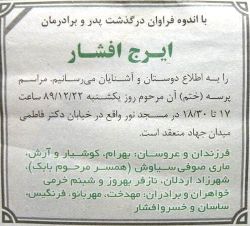 مراسم ختم(پُرسه) زندهیاد استاد ایرج افشار روز یکشنبه 22 اسفند در مسجد نور برگزار میشود. همچنین دایرةالمعارف بزرگ اسلامی روز دوشنبه این هفته( 23 اسفند) بزرگداشتی برای پدر کتابشناسی ایران برپا میکند.