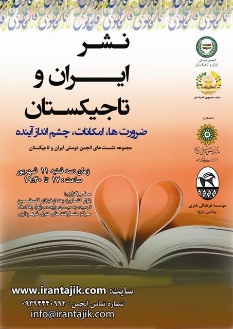نشست انجمن دوستی ایران و تاجیکستان با عنوان «نشر ایران و تاجیکستان، امکانات، ضرورت ها، چشم اندازه آینده» در روز سه شنبه 11 شهریور ماه 1393 ساعت 17 تا 19:30 برگزار میشود.